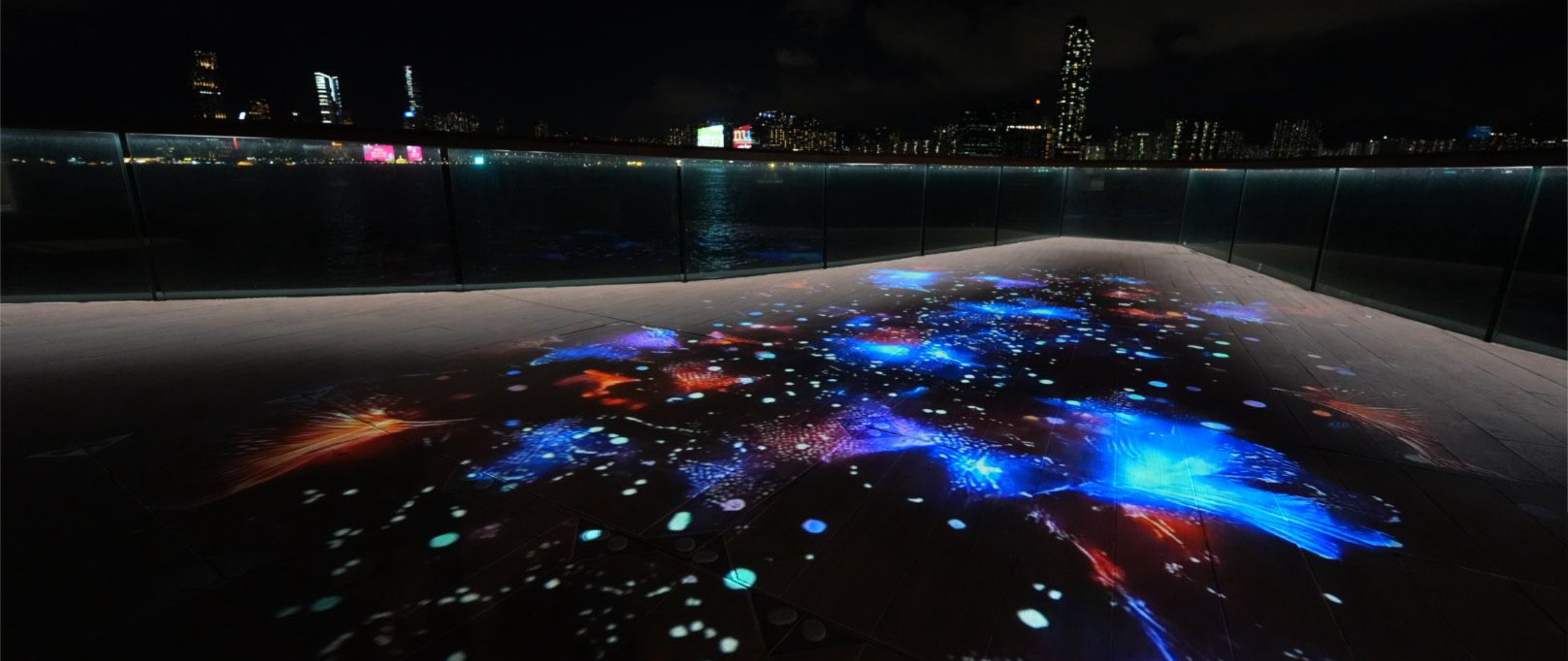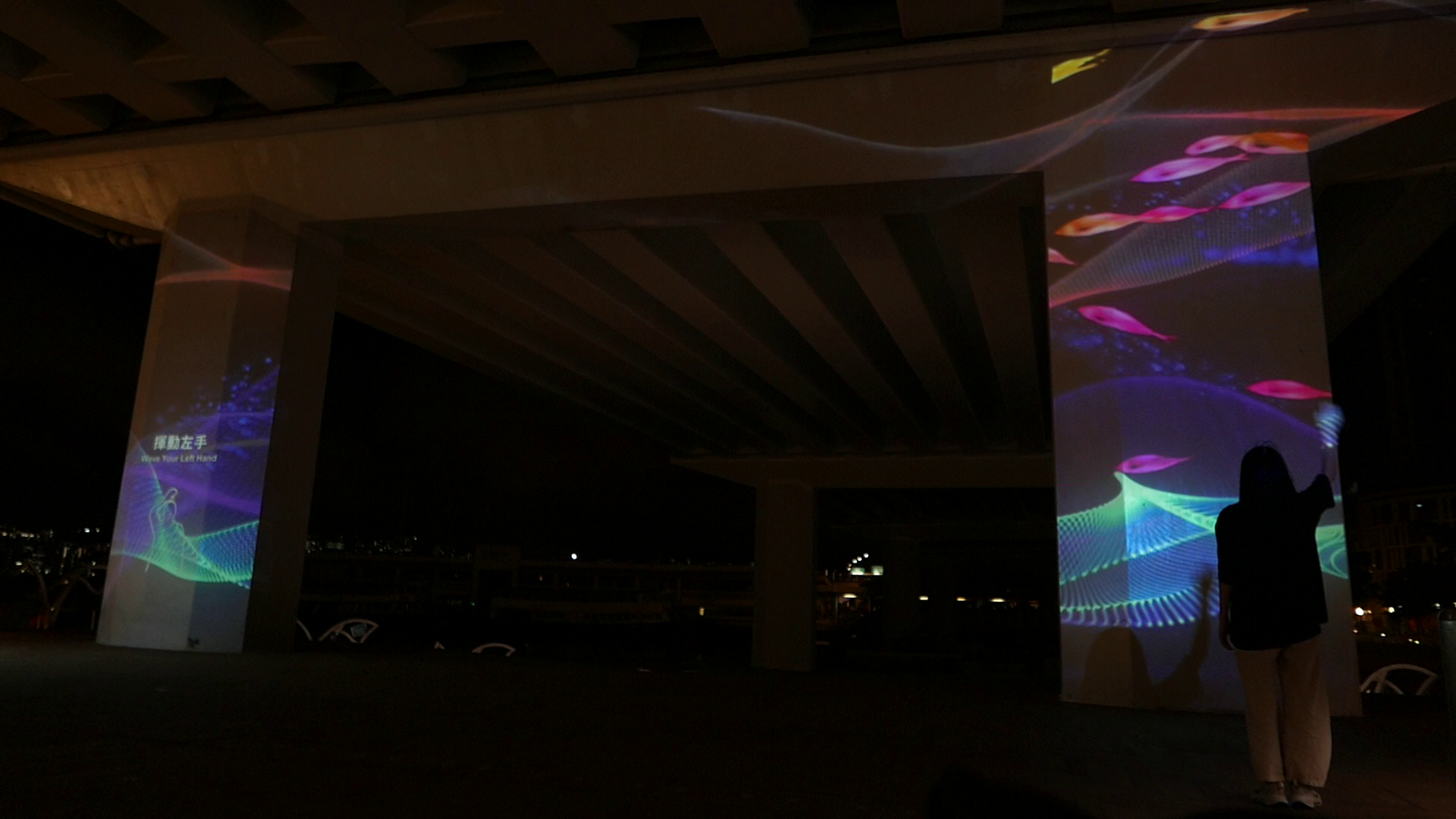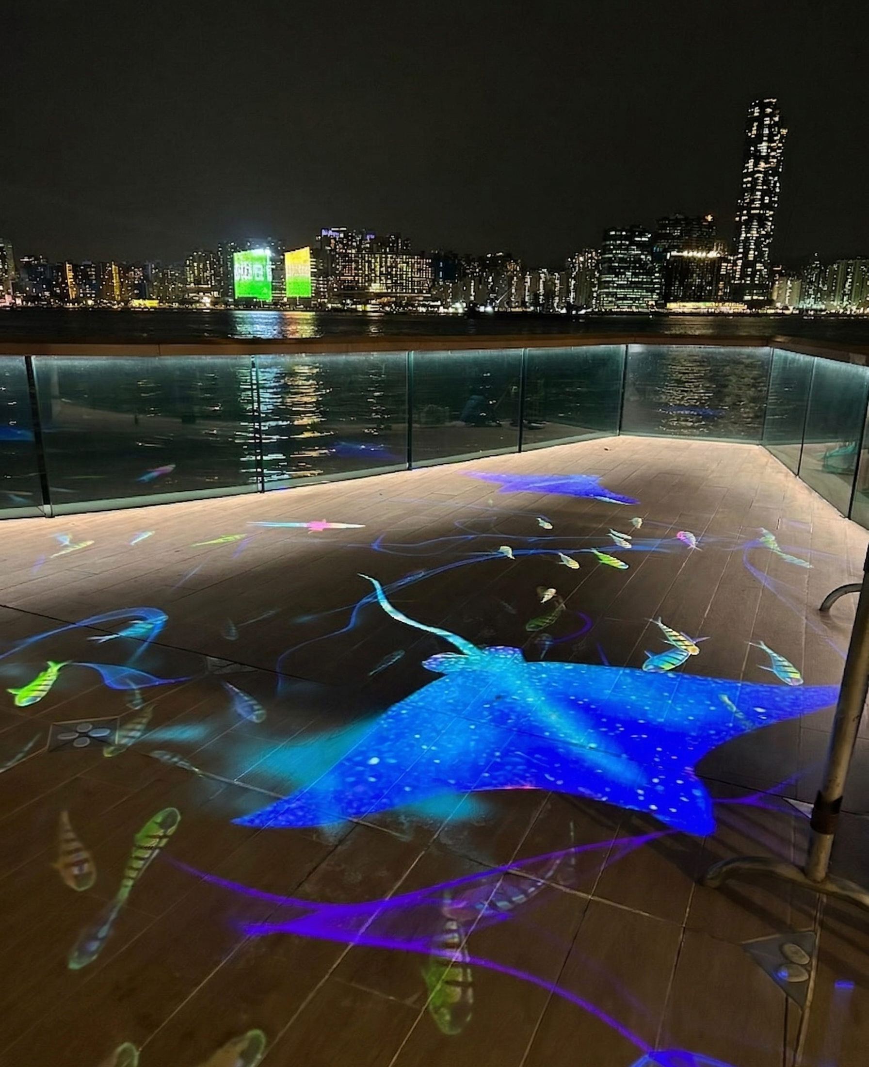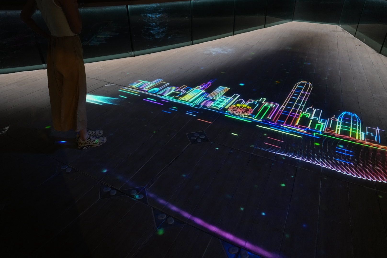 At the Viewing Deck, visitors step on floor projections to trigger dynamic particle effects. For the Fishing Deck, we implemented precise projection mapping and pose-recognition technology, where the system detects specific movements to unlock hidden visual content. By integrating responsive sensors into these public spaces, we transformed the boardwalk into an engaging, multi-sensory nighttime experience.