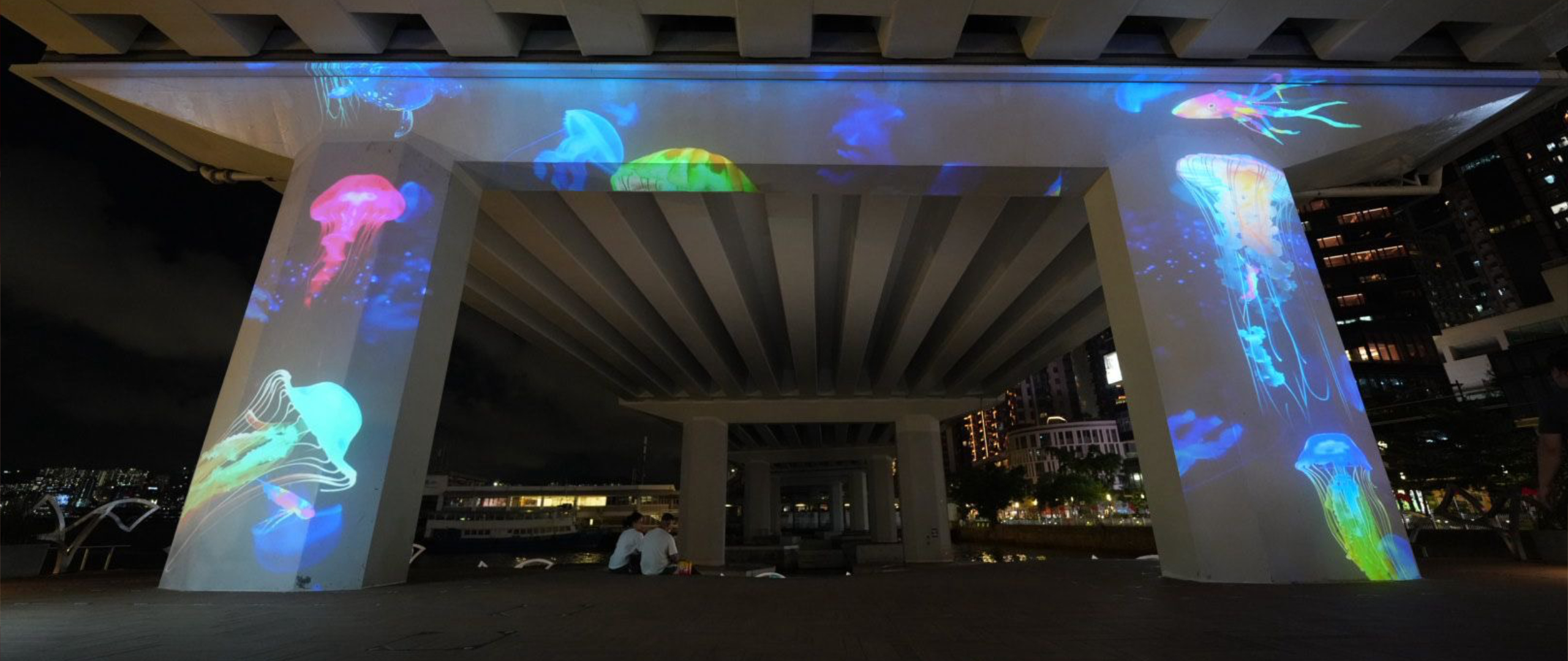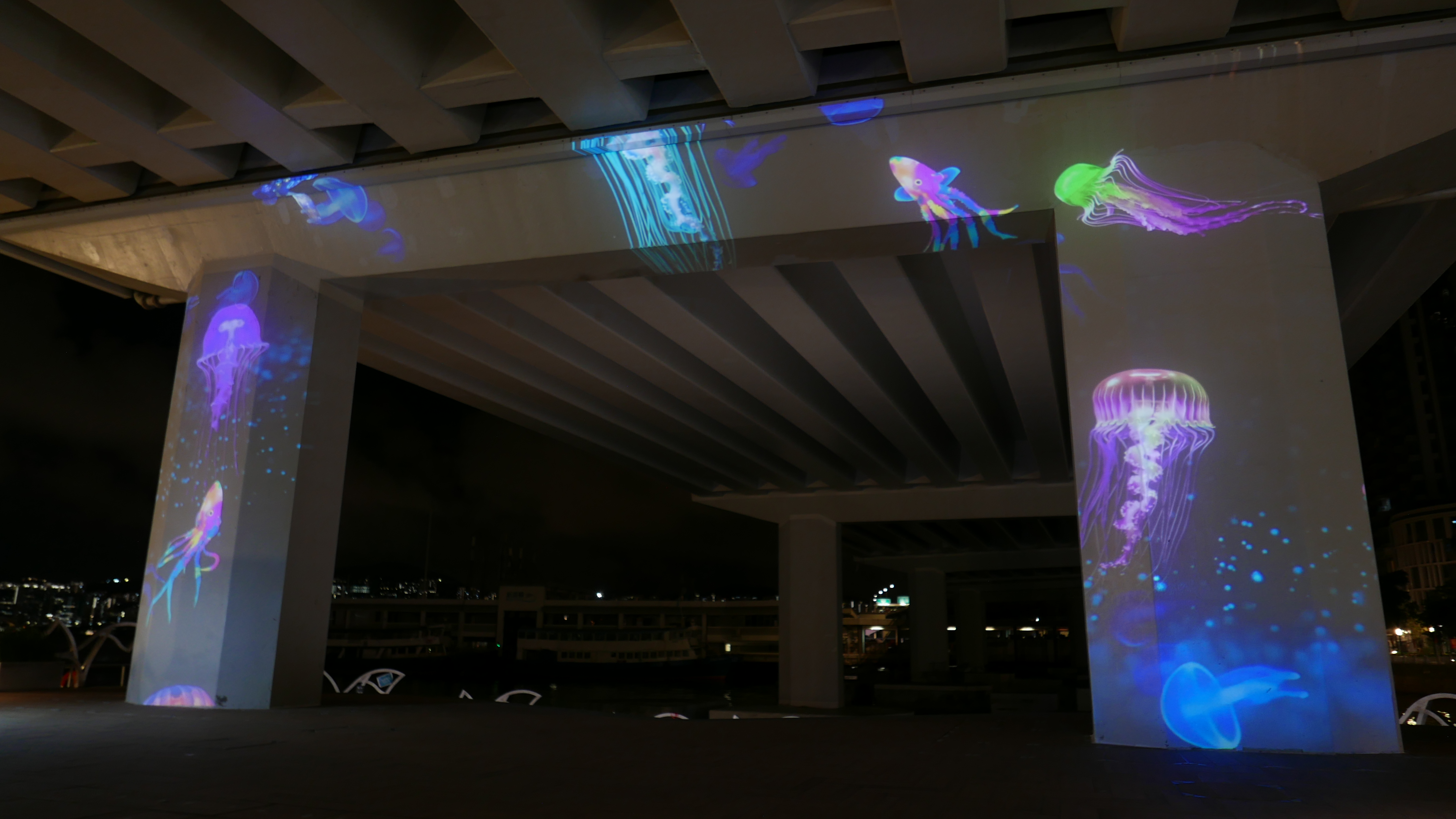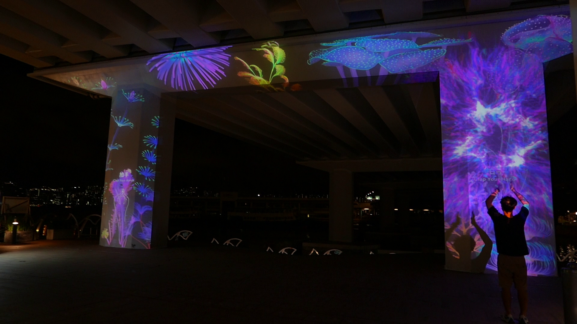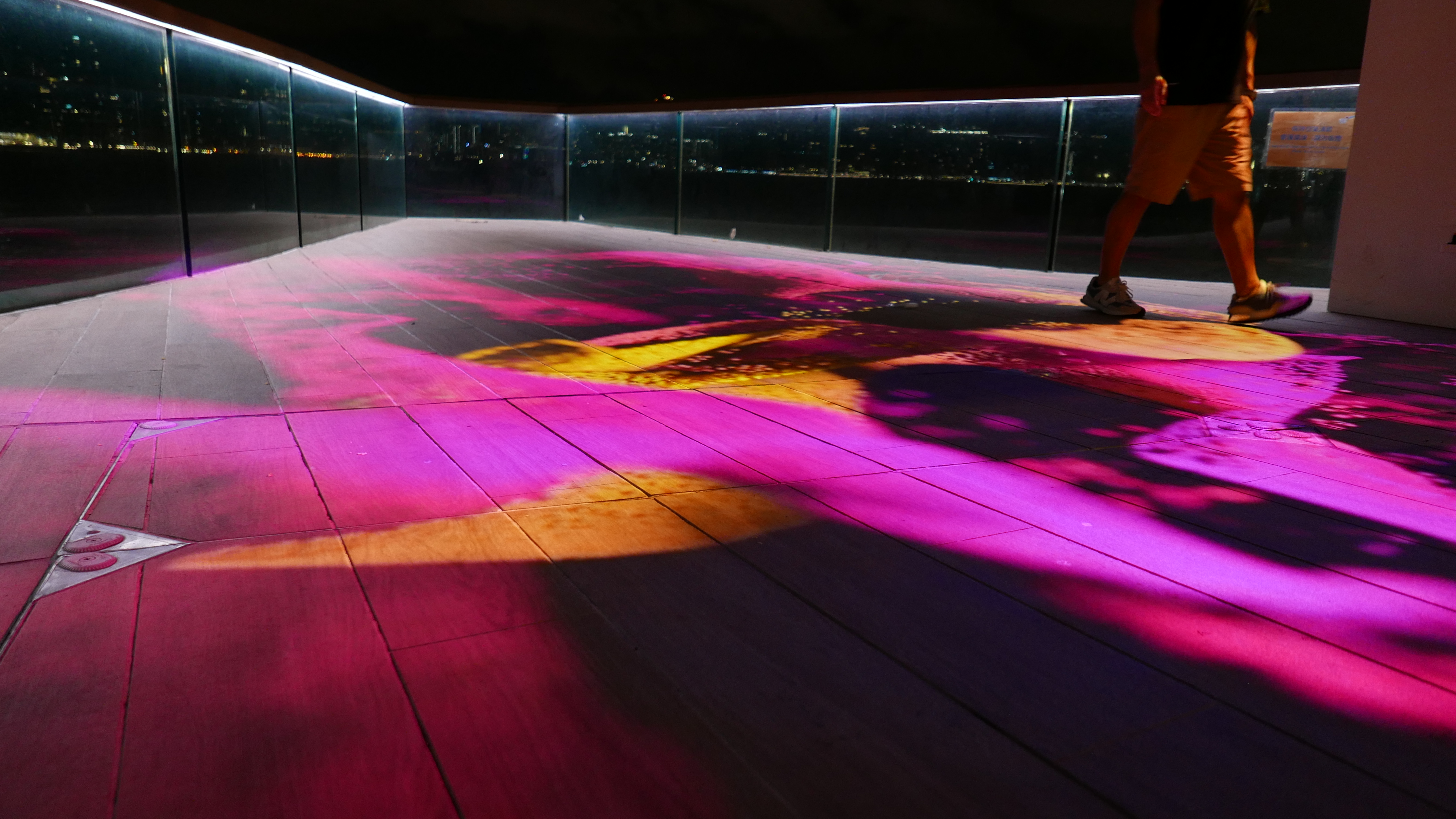 At the Viewing Deck, visitors step on floor projections to trigger dynamic particle effects. For the Fishing Deck, we implemented precise projection mapping and pose-recognition technology, where the system detects specific movements to unlock hidden visual content. By integrating responsive sensors into these public spaces, we transformed the boardwalk into an engaging, multi-sensory nighttime experience.